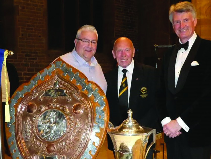 L-R: Kevin Moxon ADM with Band Chairman Ray Sykes OBE and Resident Conductor Major Ian D McElliot with the Grand shield trophy won by the band in May