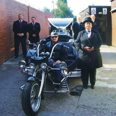 bikers-farewellThe staff of Roy Quinton, Walsall, put on their thinking caps when asked by a local family to organise a fitting funeral on the tragic and untimely loss of a family member. Carol Grice, Funeral Director, said: “The deceased was a motorbike fanatic so we set about sourcing a motorbike hearse. The cortege was led by two family members who rode pillion and by many fellow motor bikers who all travelled along the road listening to the distinct sounds of ‘Guns N’ Roses’. The service was attended by over 200 mourners. The family said they were ecstatic that we had created a memorable send off and that they have received countless compliments for such a poignant tribute.”